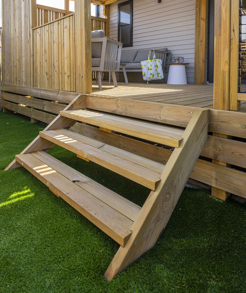 L’accès se fait en toute simplicité grâce à notre gamme de marchepieds (2 à 4 marches), avec ou sans contremarches. Pour les projets nécessitant une accessibilité renforcée, nous proposons également des rampes d’accès conformes aux attentes en matière de circulation PMR. Ces équipements font partie des accessoires pour terrasses mobil-home les plus sollicités, notamment dans les campings.