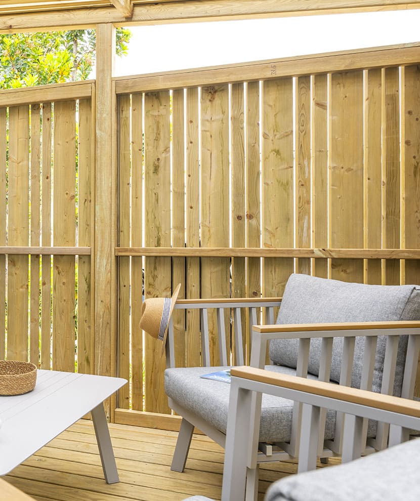 Le soubassement bois permet de fermer visuellement la base de la terrasse, pour un rendu plus homogène et soigné. Plusieurs variantes existent selon le type d’hébergement (mobil-home, chalet) et peut être monté directement sur la terrasse ou fixé sur sangles autour du mobil-home.